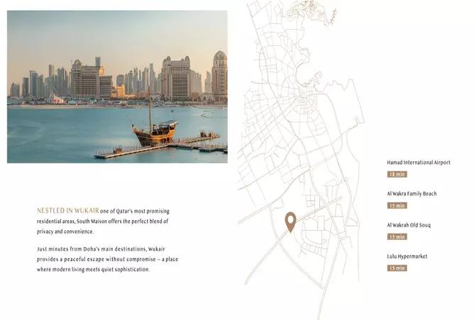 يقع ساوث ميزون في منطقة الوكير، إحدى المناطق السكنية الواعدة في قطر، ويوفر مزيجًا مثاليًا من الخصوصية والراحة.